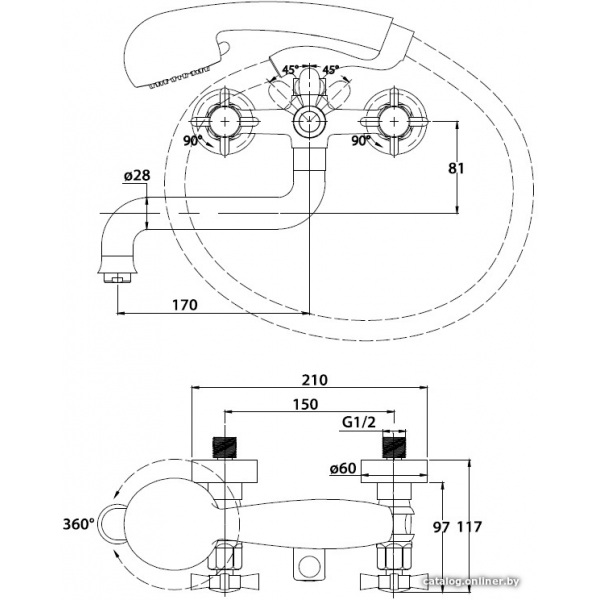 двухвентильный смеситель для ванны и душа, монтаж на стену