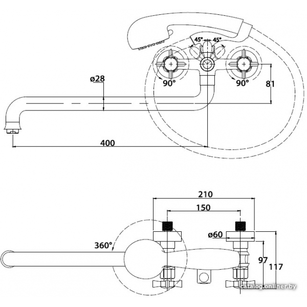 двухвентильный смеситель для ванны и душа, монтаж на стену